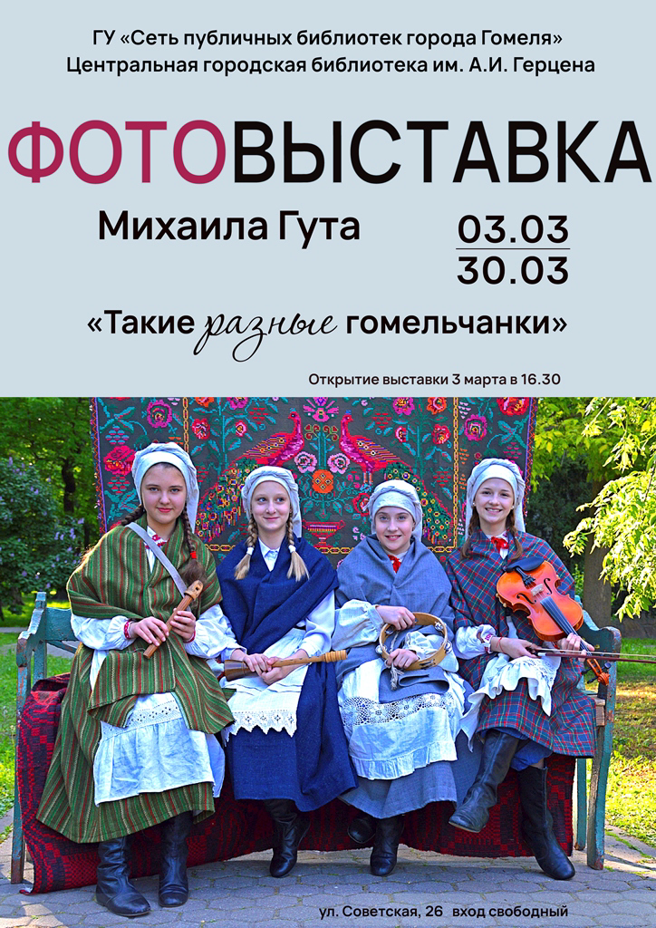 В преддверии Дня женщин, 3 марта, в 16.30 в центральной городской библиотеке им. А.И. Герцена в рамках цикла мероприятий к Году белорусской женщины и проекта «Живой автограф» состоится открытие фотовыставки Михаила Гута «Такие разные гомельчанки».