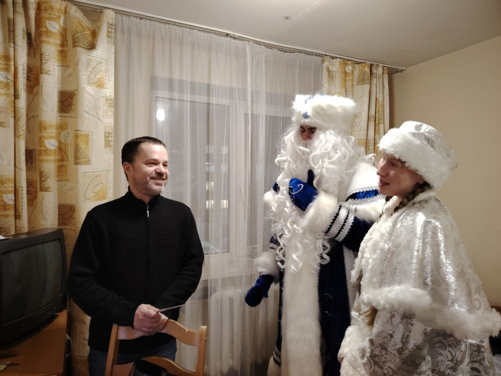 Представители горисполкома, управления по труду, занятости и социальной защите, администрации Советского района, предприятий Гомеля, а с ними Дед Мороз и Снегурочка двумя группами постарались охватить всех жильцов вниманием и заботой.