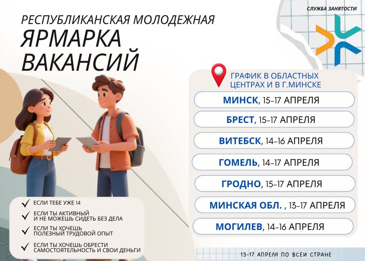 13.04.2026В Беларуси 13 апреля стартует Республиканская ярмарка вакансий для молодежи