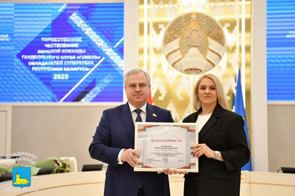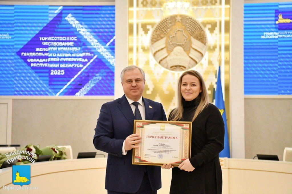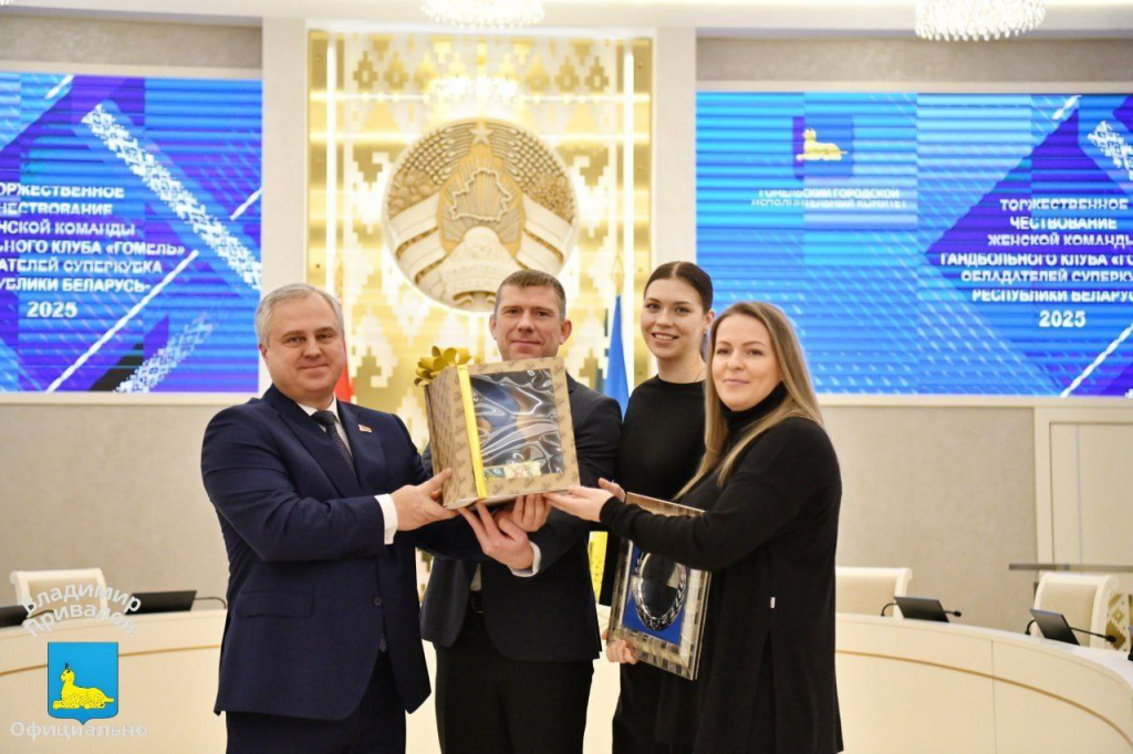 В стенах Гомельского городского исполнительного комитета прошло торжественное чествование женской команды гандбольного клуба «Гомель» – обладателей Суперкубка Республики Беларусь – 2025. Заслуженные награды в Год белорусской женщины спортсменкам вручил мэр города Владимир Привалов.